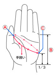 親指の第一関節とほぼ同位置にあたる生命線の始点を(A)。小指の付け根から手首を結んだ線(B)の手首から1/3の位置を(C)とし、(A)と(C)の2点を通る手の外周の事を「手囲い」と呼びます。