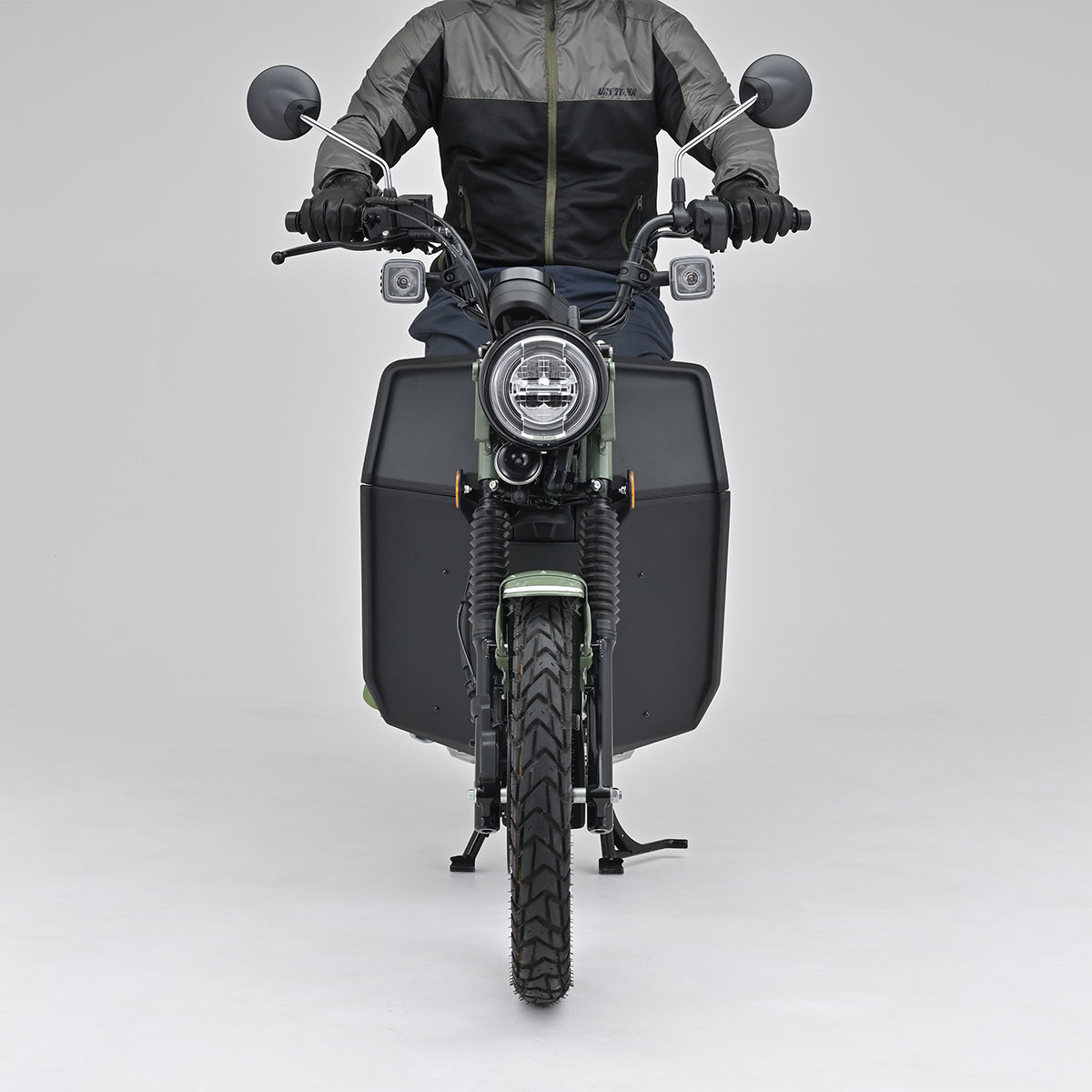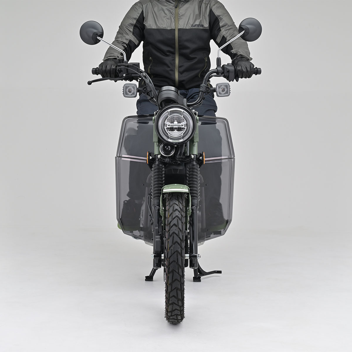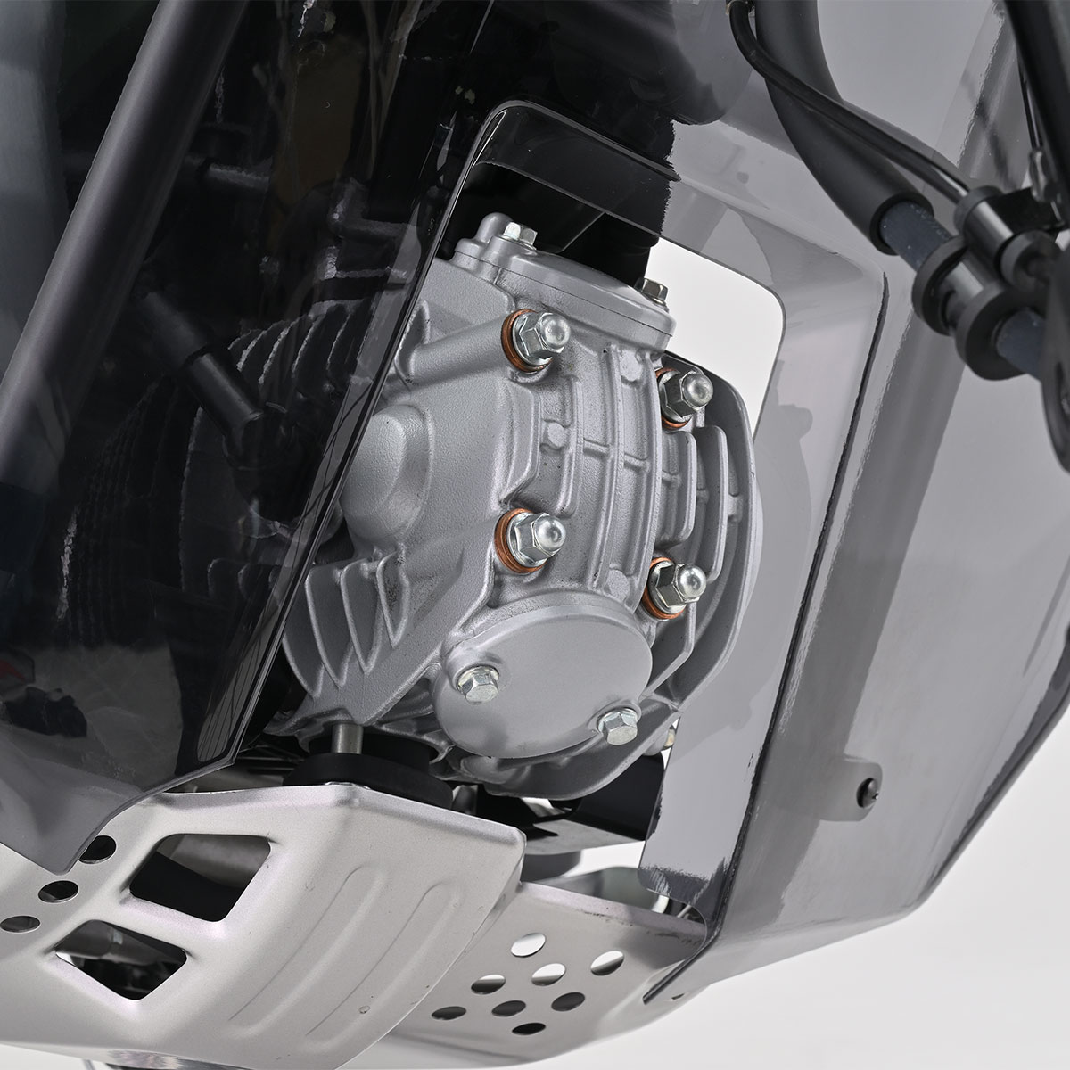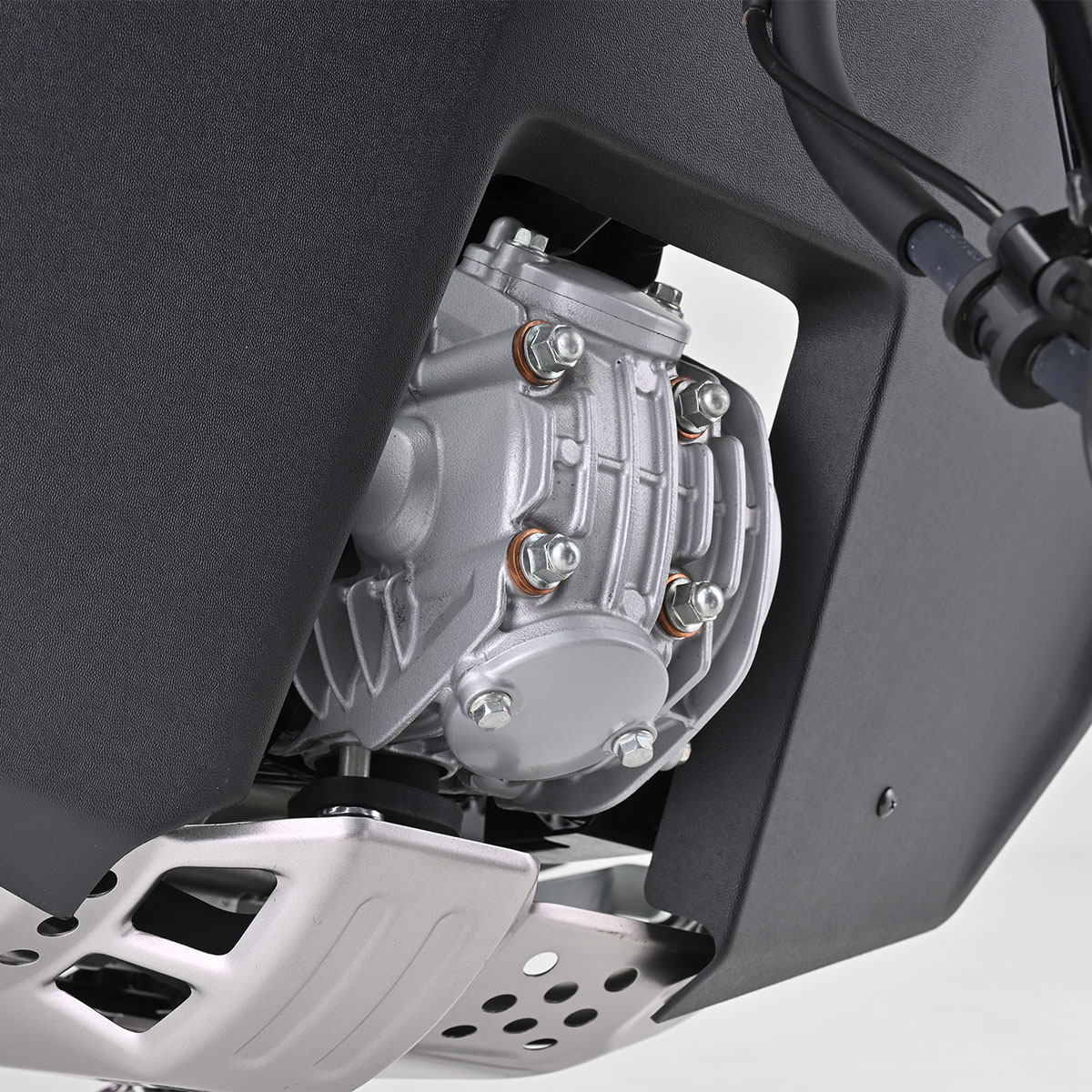 エンジン部分をダクト形状にすることでエンジン冷却と足首への防風効果を最大限両立。フロントタイヤからの泥はねも軽減します。
