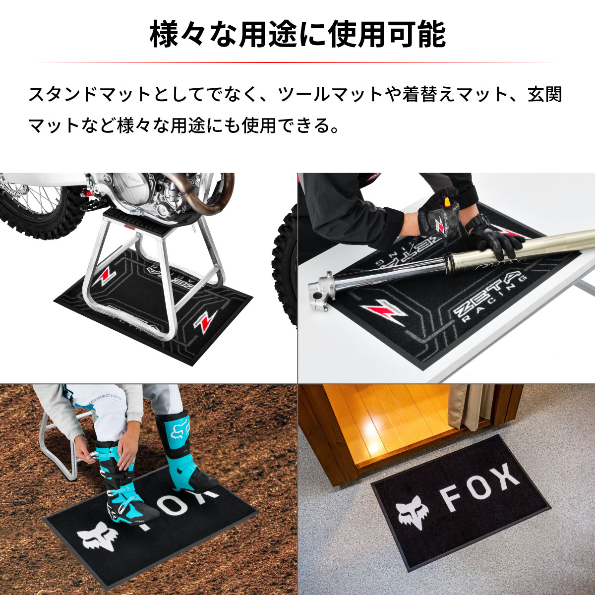 カーペット部分は吸水性・耐久性・耐磨耗性にも優れるナイロン素材。ベースシートにはTPR素材を使用することで柔軟性に優れ、グリップ性が高く滑りづらい。また、スタンドマットとしてでなく、ツールマットや着替えマット、玄関マットなど様々な用途にも使用できる。難燃素材を採用。