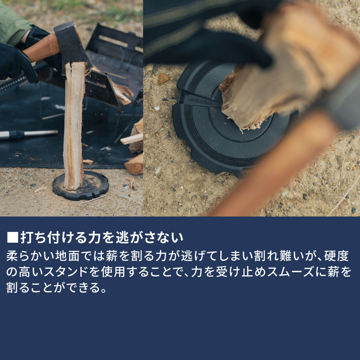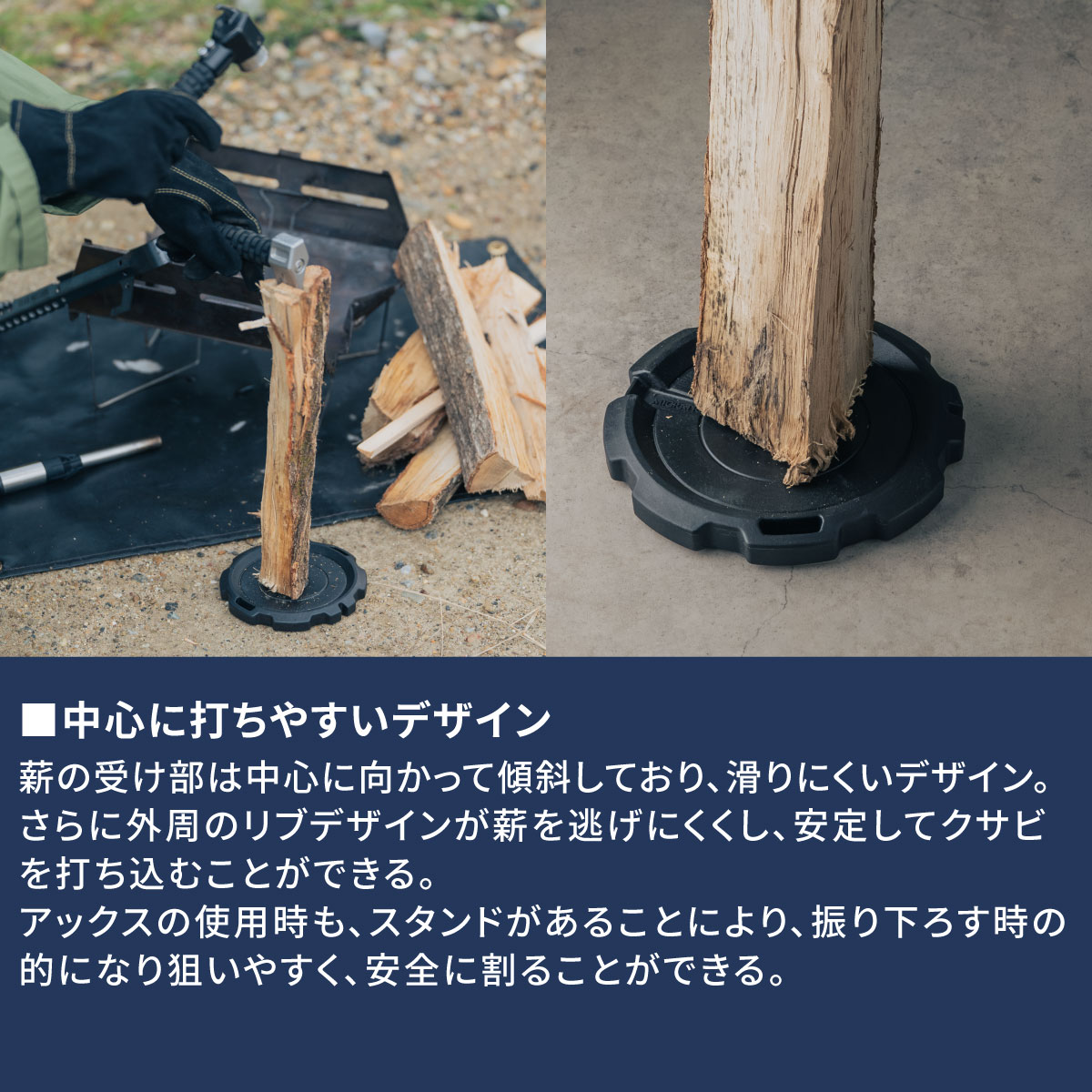 薪割りを安全かつ割りやすくするスタンド。柔らかい地面でも薪に加わる力を逃がさず、スムーズに薪割りできる。