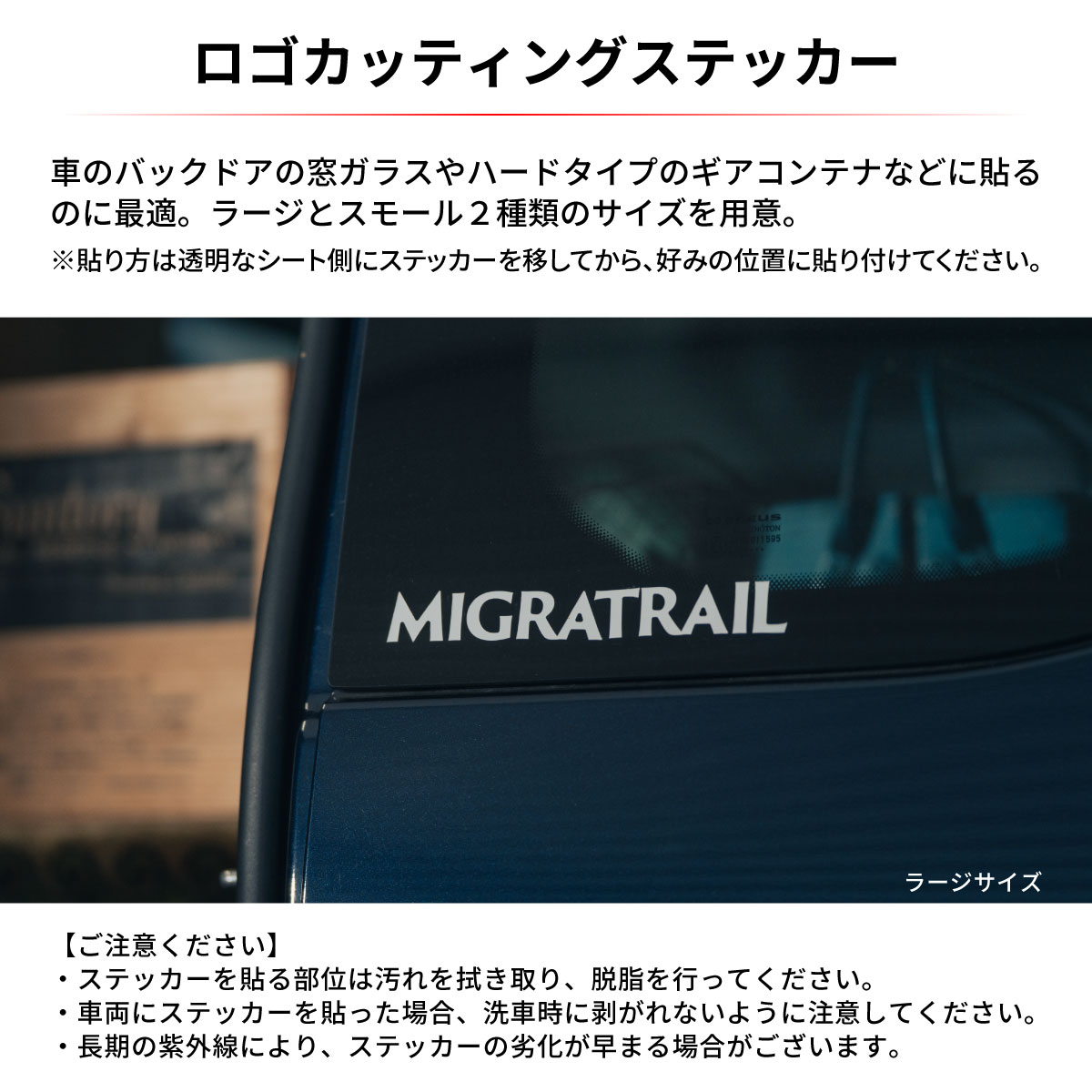 ステッカーを貼る部位は汚れを拭き取り、脱脂を行ってください。<br>車両にステッカーを貼った場合、洗車時に剥がれないように注意してください。<br>長期の紫外線により、ステッカーの劣化が早まる場合がございます。