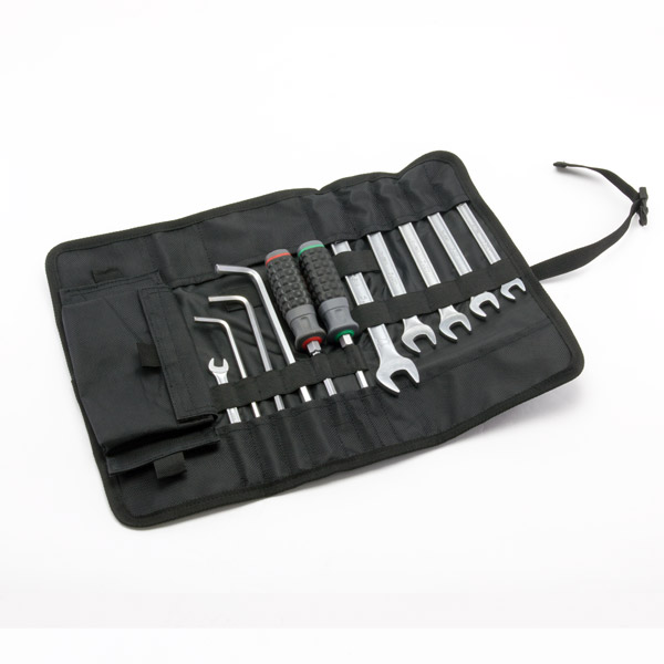 使用頻度の高いツールを持ち運ぶのに最適。チェーンリンクなどのこまかい消耗部品を入れられるポケットを装備。折りたたみサイズ : 横 30× 縦 15cm