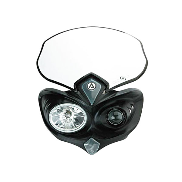 大型リフレクターライトと小型プロジェクターライトを左右に配した非対称デザイン。12V/55W H3バルブを採用し、従来品に比べ格段の照射輝度UPを実現。光軸調整機能やライトへのダメージを軽減するライトカバーなど、各ライディングシーンを見据えた高機能モデル。