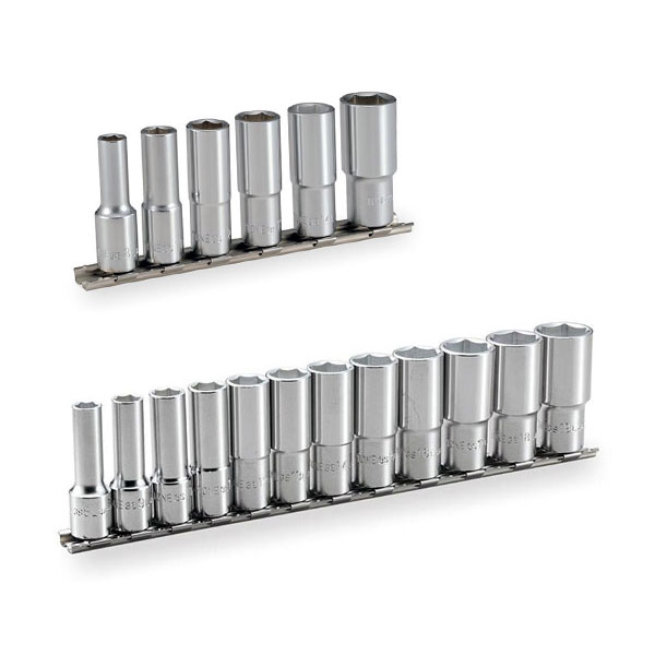 バイク整備での使用頻度が最も高い差込角9.5mm(3/8インチ)のディープソケットのセット。通常のソケットではアクセスできない場所のボルト・ナットを回す際に大変便利。ソケットの口径形状はボルト・ナットを入れ易く、作業性に優れた12角タイプ。収納に便利なソケットホルダー付き。