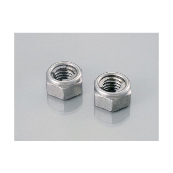 フリクションリングのインサートによりプリベリングトルク発生部を持ち、それによる摩擦抵抗によって戻り止めの要素として、ネジ部のトルクが大きくなるナット。(2個)