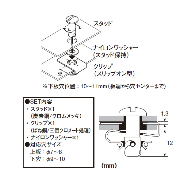 カウル等の取り付け・外しに便利なクイックファスナー。スタッドはスロットタイプとリングタイプの2種類をラインナップ。対応板厚:1.5~2.0mm(上板・下板共)
