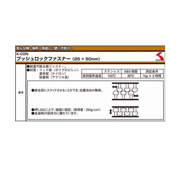 押し込むことで強固に固定が出来る脱着可能な面ファスナー。(耐荷重:250g/cm2)接合前にスライドさせることができ、位置決めが簡単。高温時の保持力に優れています。両面テープ貼り付けタイプオス/メス 1セット