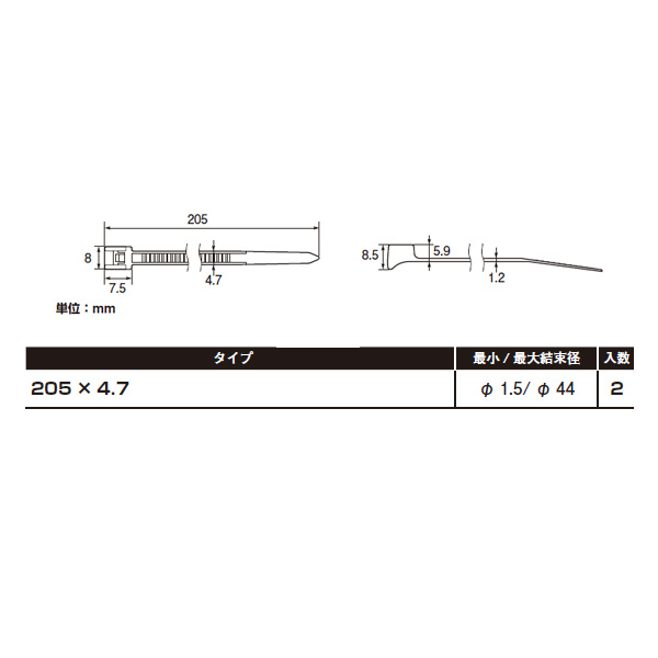 結束した際にループが円形に近い形状になるようヘッドが工夫されたタイ。真円に近いホースを結束するのに最適です。使用温度範囲:-40~105℃耐熱タイプ
