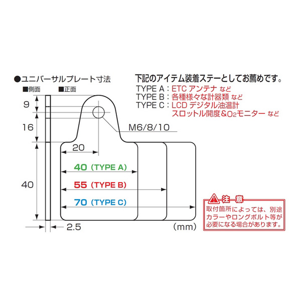 プレート固定はM6/8/10 ボルトや、ミラー等と共締め出来るように豊富にラインナップ。
