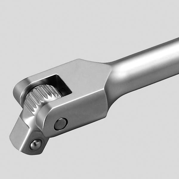 角ドライブは柄の頭部にあるピンを中心に両側に90度屈折し、15度づつの角度調節ができます。仮締めなどで早く回す時にはハンドルを立てて使い、ハンドルを横にすると本締めができます。