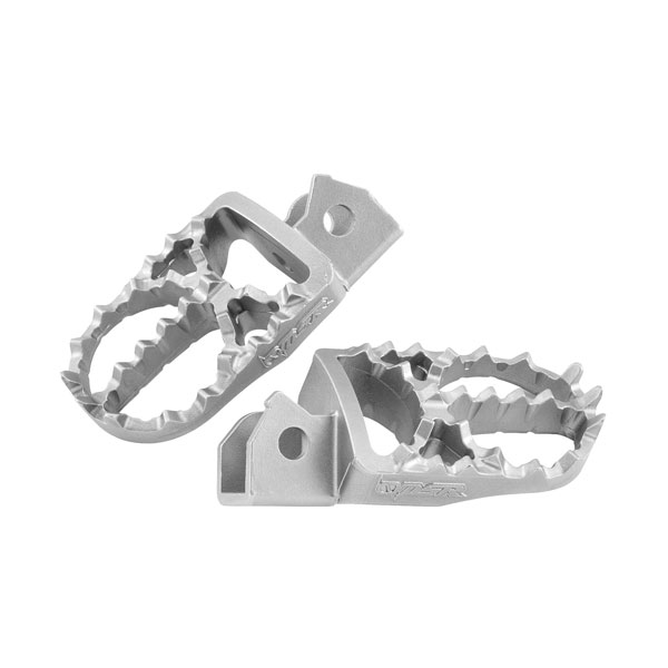 オフセットタイプのステンレス製フットペグ。13mm後方にオフセットされた形状は、リヤタイヤへのトラクションが増大してヒルクライムでの登坂力が向上します。また、幅55mmのワイドタイプでありながら、アーチ状になっている為、スムーズに体重移動させることができるだけでなく、加重する角度が斜めになってもしっかりグリップします。歯のデザインは、一般的なスタンダード歯タイプと、「S」字パターンにすることでグリップ力を高めたS字歯タイプをラインナップ。