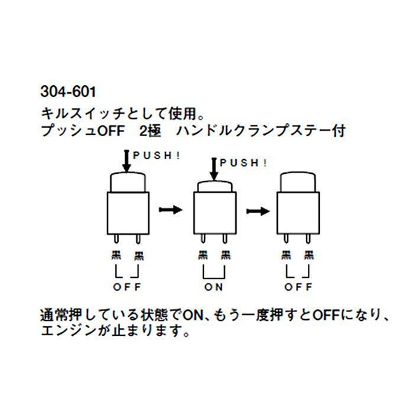 キルスイッチとして使用でき、ハンドル等に取り付けできる様クランプタイプステー付です。スイッチを押している間だけ黒、黒/白間が通電します。(本製品は2Pカプラーです。)プッシュOFF 2極