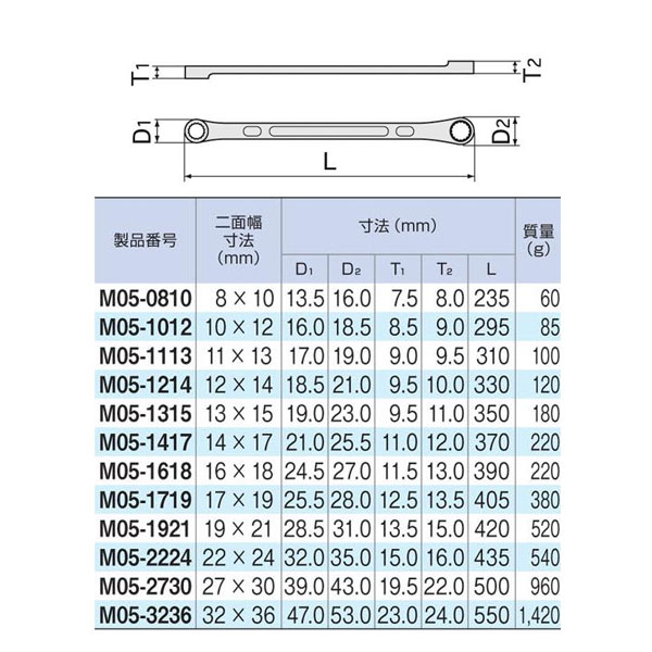 高さ制限のある狭い箇所や奥深い場所での作業に最適です。全長が長いので小さな力で締付け・緩め作業ができます。めがね部は12角なので、ボルト・ナットに対し容易にはめ合わせができます。