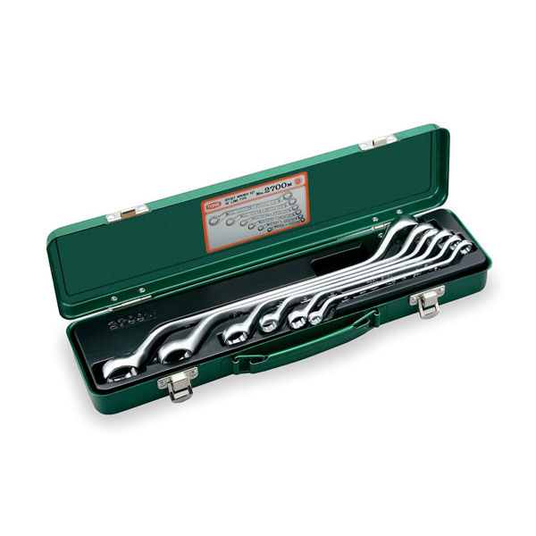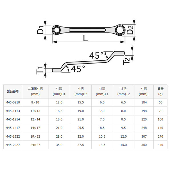 柄部の曲がり角度が45゜になっていますので、周辺の障害物を避けて作業ができます。めがね部がリング状になっていますので、ボルト・ナットから外れにくく周囲均等に荷重を受けるため、強力で確実に締付けることができます。めがね部は12角のためボルト・ナットにはめ合わせやすく、比較的狭い場所でも作業が容易です。