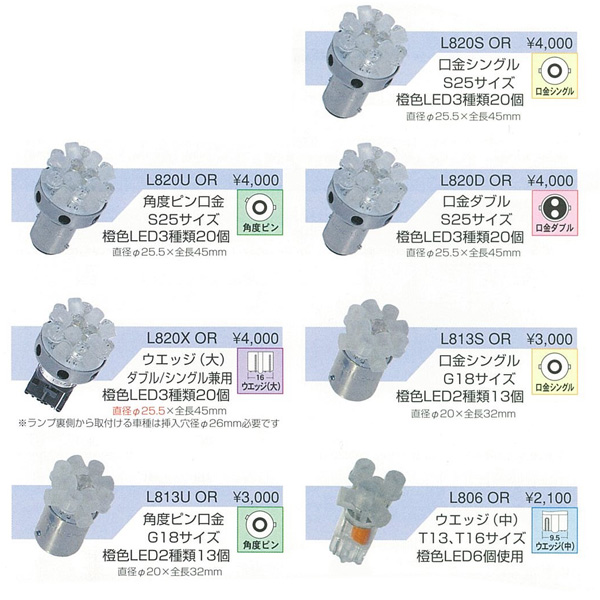 Lビーム オレンジモデルが新採用のLEDと新設計の回路で大幅パワーアップして新登場! 高拡散のディフューザーフラットLEDを使用することにより、従来品よりも横方向の光の広がりがアップ!電球を横向きに差し込むウインカーランプでも、リフレクターの反射を活かし明るく輝きます。