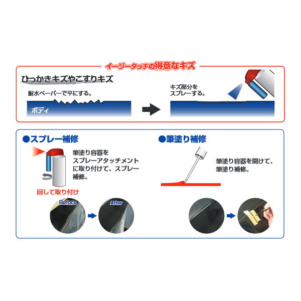 筆とスプレーで簡単補修。2通りの使い方が可能。筆塗りから簡単にスプレーに変身。広い傷にはスプレー補修、小さい傷には筆塗り補修ができるハイブリット商品。