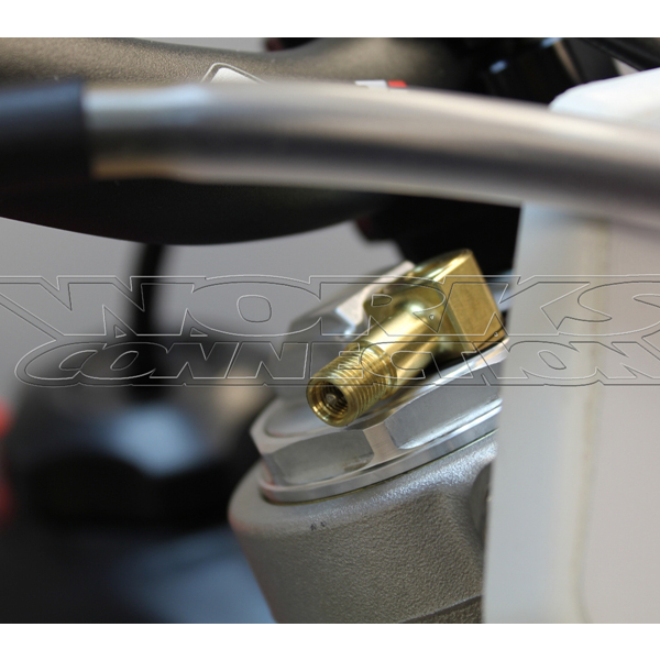 フロントフォークの空気圧調整を楽にする便利アイテム。・回転式なのでエアゲージの装着が簡単・フロントナンバープレートを脱着不要