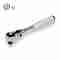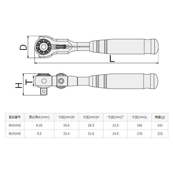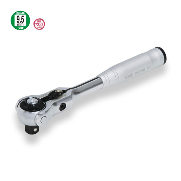 72枚歯に対して2つのセグメントカムにより歯数144枚相当を実現(送り角2.5°)。ヘッド部はロック機構により自在に角度の調節ができます。グリップ部はアルミ製で軽く、ショートタイプで作業性が良好。ソケットの着脱が容易で、作業時には外れにくいソケットホールド機構付。ワンプッシュ操作でソケット交換ができます。