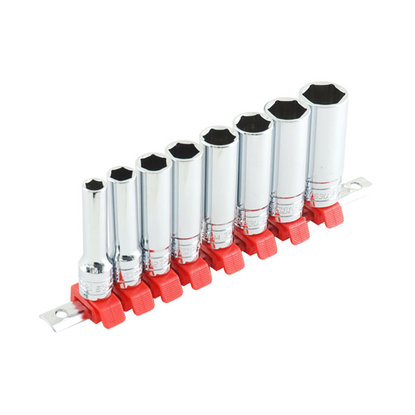 差込角9.5mmのミリサイズ対応ソケット8個組セット。全長が長いので、奥まった場所での作業に最適です。新型ソケットホルダーを採用しました。ワンタッチ操作で、簡単にソケットを取外せ、確実にソケットを取付けられます。六角ボルト(ミリ)に対応します。ボルトが飛び出している場合やエクステンションバーを使わずにダイレクトに使用することも可能です。