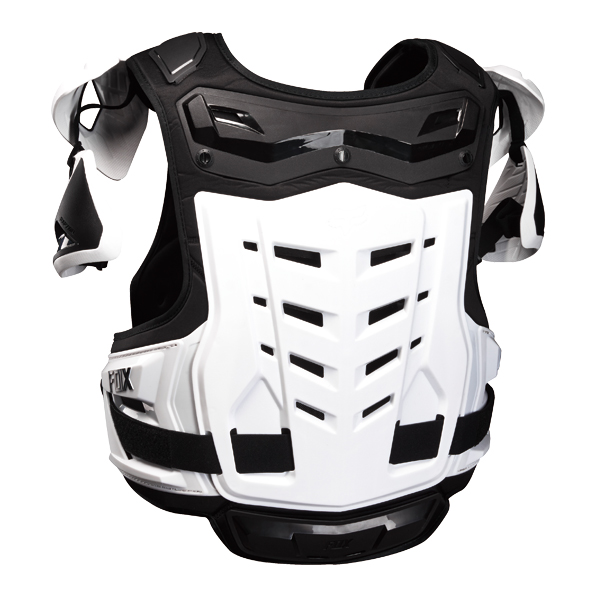 上半身全体をフルカバーできるボディプロテクター。プラスチック製サイドプレートが側面までしっかりとカバーする。肩・二の腕用のプロテクターは調節および取り外しが可能。バックパネルはCE認可取得済。薄型デザインは様々なネックブレースにマッチする。