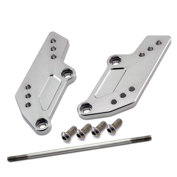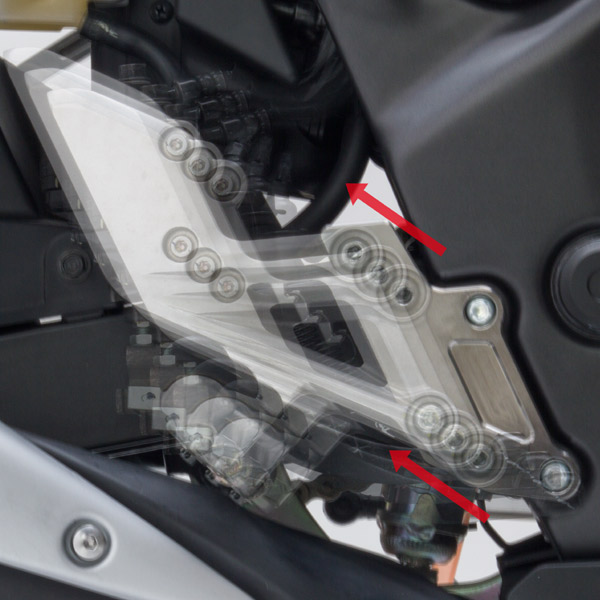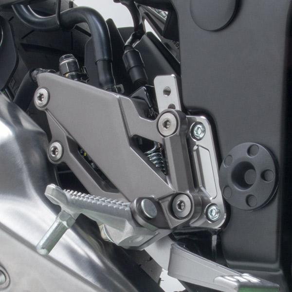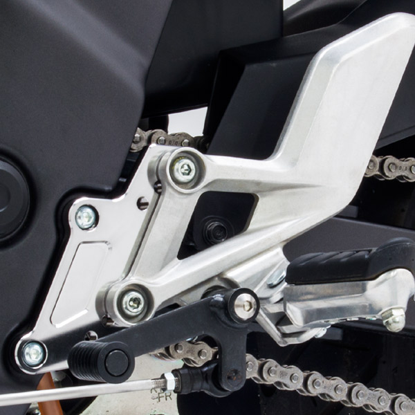 純正ステップを後方にオフセットさせることで、より自然なライディングポジションを提供。ブレーキホースを変更することなく、純正ステップホルダーがボルトオンで取り付け可能。また、3段階のポジション調整を可能とし、好みの位置を選択できる。ブラケットは高強度ジュラルミンをCNC加工後、チタンカラーアルマイト処理を施す。