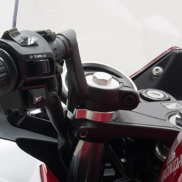 ハンドルバーの高さを上げたい場合に最適なスペーサーキット。CBR250Rの純正ハンドルに対応する専用設計。高強度ジュラルミン材をCNC加工後、チタンカラーアルマイト処理を施す。スペーサー厚 : 10mm