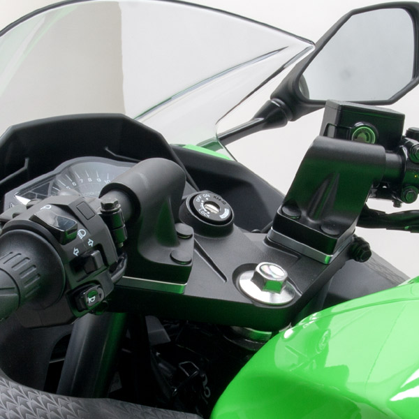 ハンドルバーの高さを上げたい場合に最適なスペーサーキット。NINJA250/Rの純正ハンドルに対応する専用設計。高強度ジュラルミン材をCNC加工後、チタンカラーアルマイト処理を施す。専用ステンレスボルト付属。スペーサー厚 : 8mm