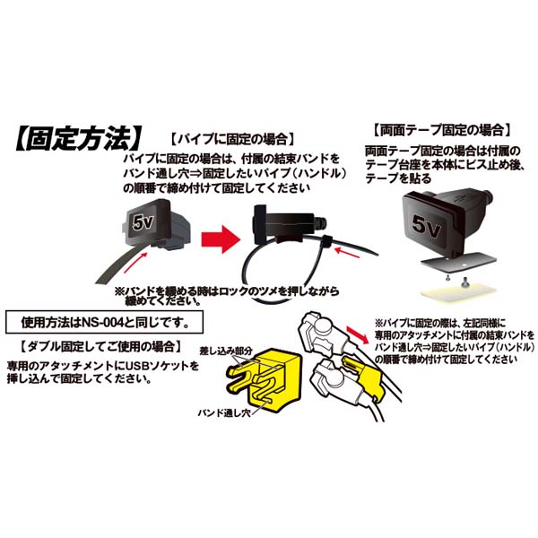 取り付けカンタン!結束バンド以外にも付属の両面テープでの固定もOK!