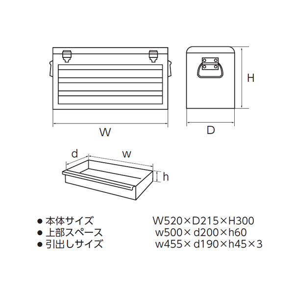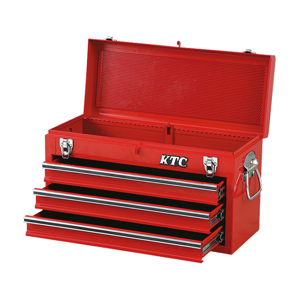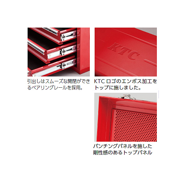 コンパクトサイズながら収納量豊富なツールボックス。引出し部分は開閉がスムーズなベアリングレールを採用。持ち運びに便利なサイドハンドル付。