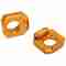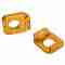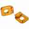 前側・後側でオフセット量が異なるデザインを採用したアクスルブロック。高強度ジュラルミン材をCNC加工後、カラーアルマイト処理を施す。ゴールドとチタンカラーをラインナップ。