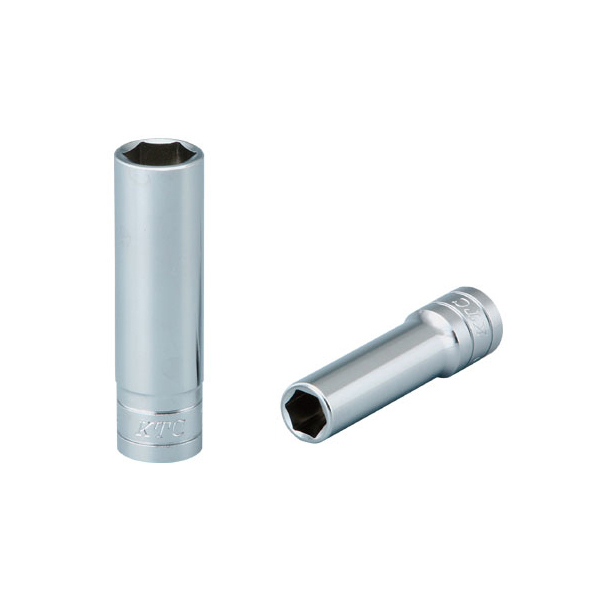 バイク整備での使用頻度が最も高い差込角9.5mm(3/8インチ)のディープソケット。通常のソケットではアクセスできない場所のボルト・ナットを回す際に大変便利。口径形状は強度・耐久性に優れ、ボルト・ナットの角を傷めにくい6角タイプ。口径部と差込角にはKTC独自のパワーフィット形状を採用。