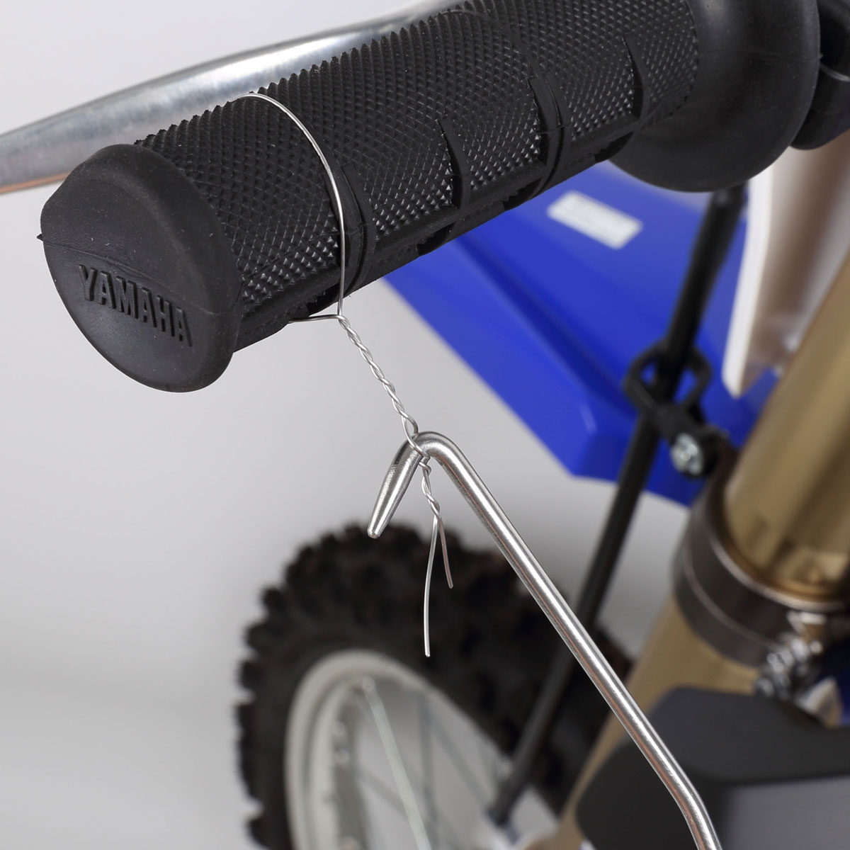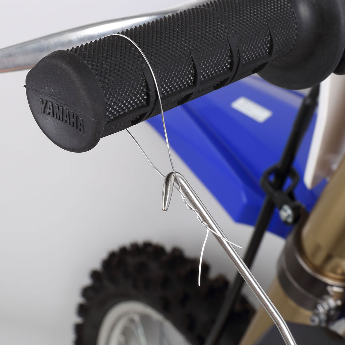 グリップの回り止めやボルト・ナットの脱落を防止するワイヤリングの必需品。巻きつけたステンレスワイヤーに先端を掛けて、グリップ部を回転させて使用する簡易タイプ。