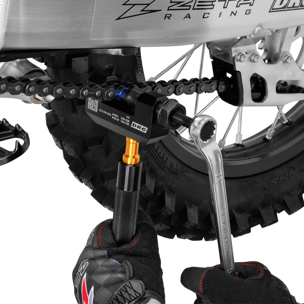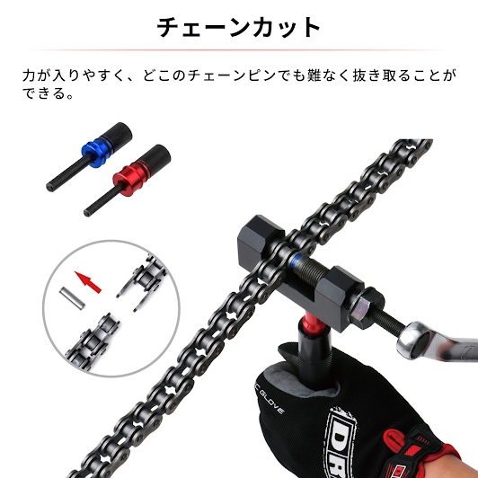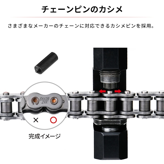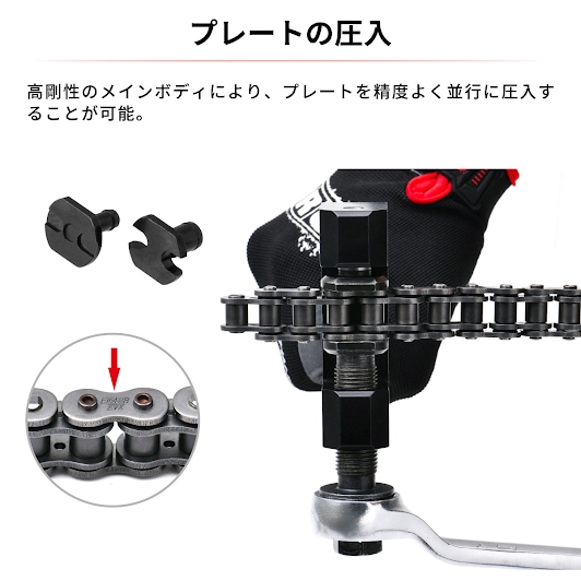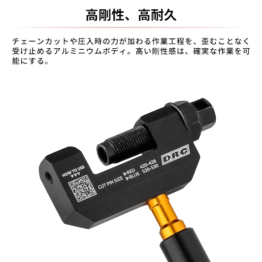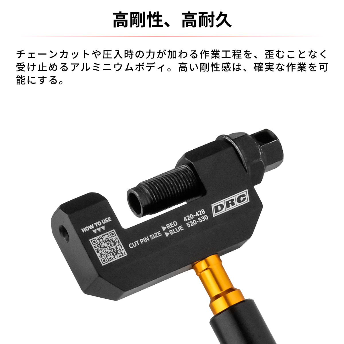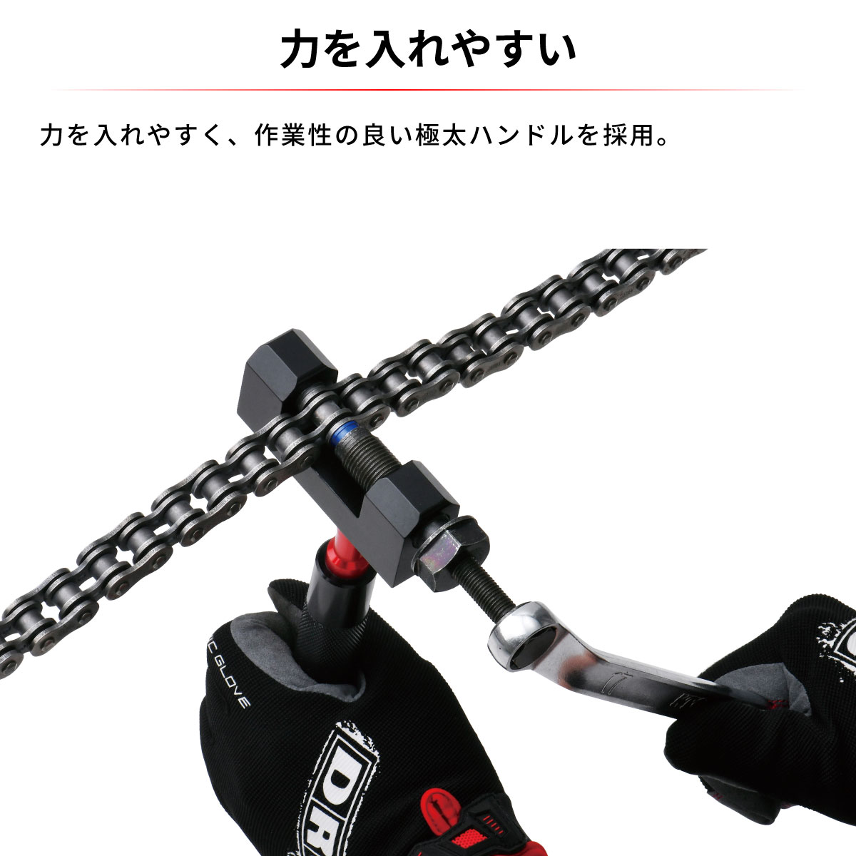 チェーンのカット、プレートの圧入、かしめの3つの作業が可能。作業の流れを考慮したシンプルな部品構成で420 / 428 / 520 / 525 / 530サイズのチェーンまで対応。ボディは軽量なアルミを採用。ヘッドピンをボディ(ハンドル内)に収納できることにより、部品がばらつかず工具箱にすっきり収まる。