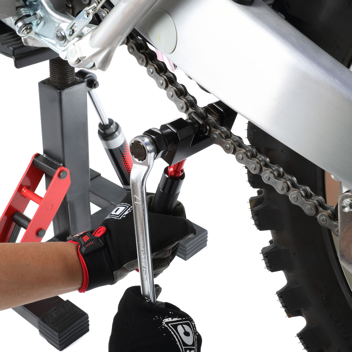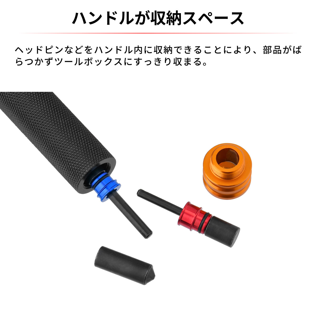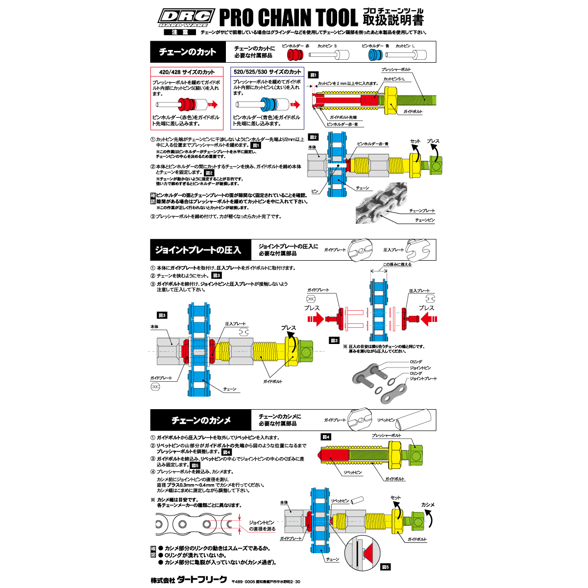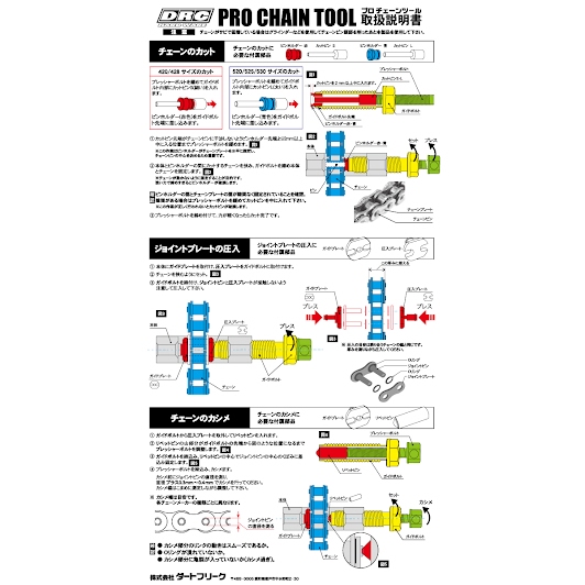チェーンのカット、プレートの圧入、かしめの3つの作業が可能。作業の流れを考慮したシンプルな部品構成で420 / 428 / 520 / 525 / 530サイズのチェーンまで対応。ボディは軽量なアルミを採用。ヘッドピンをボディ(ハンドル内)に収納できることにより、部品がばらつかず工具箱にすっきり収まる。
