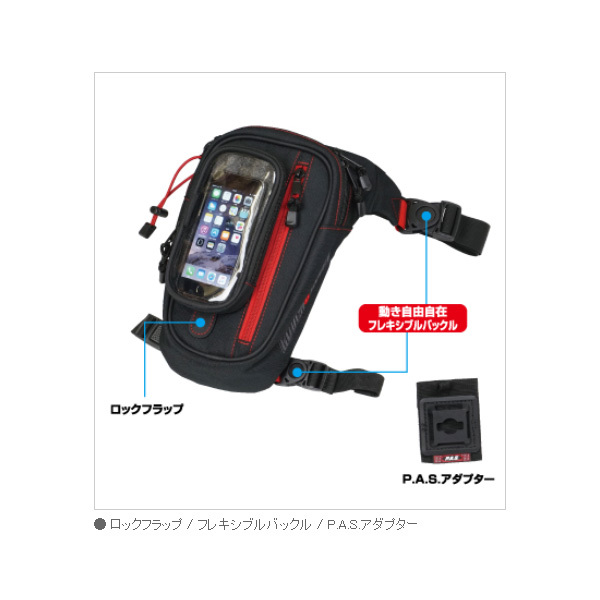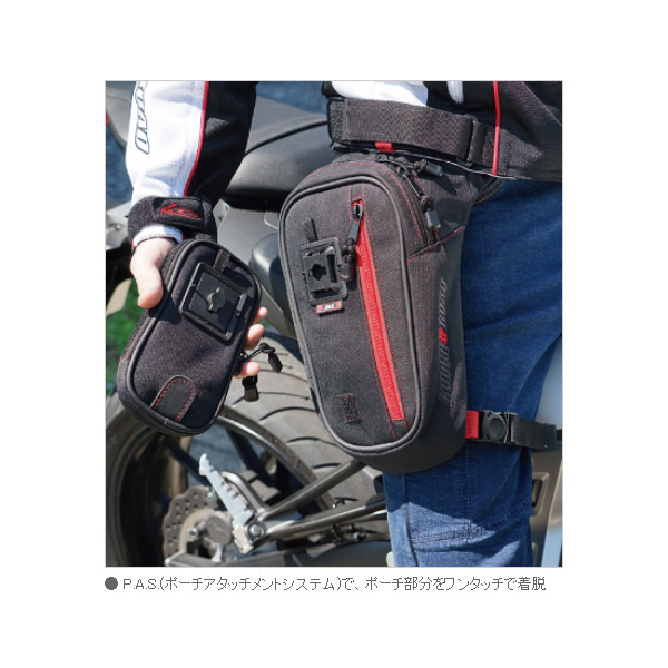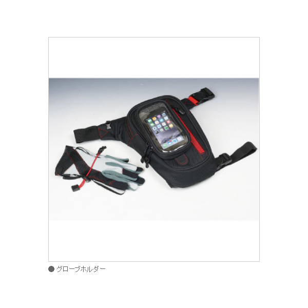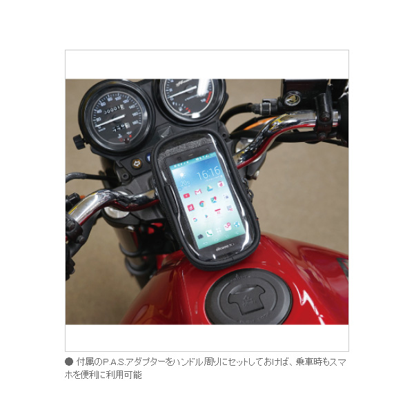 今や生活必需品となった6inサイズまでのスマートフォンを、乗車時も降車時もスマートに持ち運べる別体式ポーチが付属した、便利な2ピース式ホルスターバッグです。付属のP.A.S.アダプターを乗車時はハンドル周りに設置、降りたときにはバッグやダイレクトにボディへ設置可能なP.A.S.システムの利便性が最大限に反映された、今の時代のためのホルスターバッグです。 スマホをポーチに収納できるので、メインのスペースに貴重品などを余裕を持って収納できるのも魅力。また、降車時に脱いだグローブをバインディングできるグローブホルダー、オプションでコインホルダー増設可能と、デイリーユースからツーリングまで、賢くスマートに働く今の時代を象徴するバッグです。