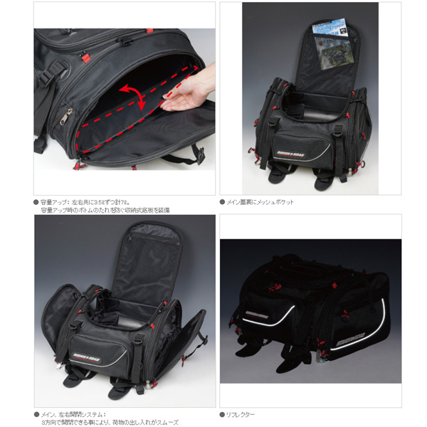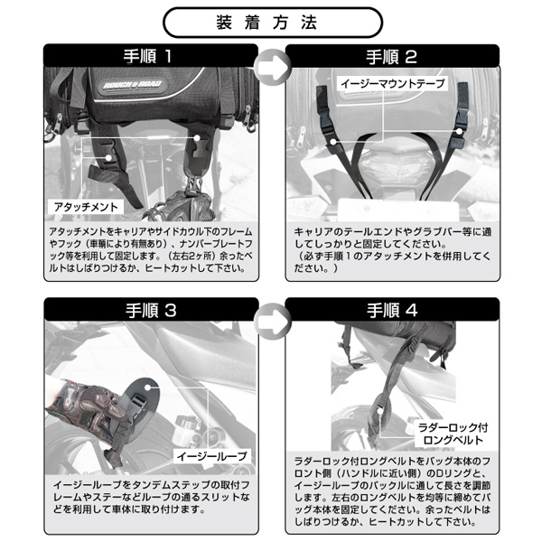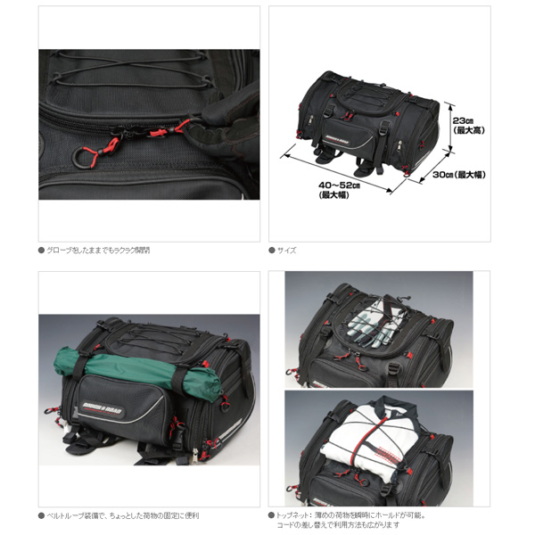 バッグトップのユーティリティバンジーコードは脱いだ衣類を挟んで固定するなどが可能で、さらに大きな荷物をバインディングしたいときはフックの位置を移動して対処可能な2wayタイプ。レインカバー、固定用ベルト類も装備したキャンプツーリングにも対応可能なミドルレンジリアバッグです。