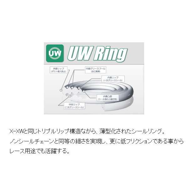 独自開発の薄型シールリングが、ノンシールチェーンと同等のチェーン幅(ジョイント部ピン全長)を実現。純正装着品がノンシールチェーンだった旧車を始め、ワイドタイヤ化でクリアランスが求められるケースで決定的な解決策となります。