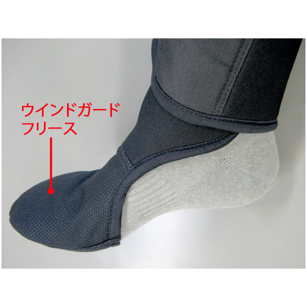 ・つま先部には、すべりのよい表素材と、暖かいフリース裏素材の間に防風フィルムをサンドしたウインドガードフリースを採用。