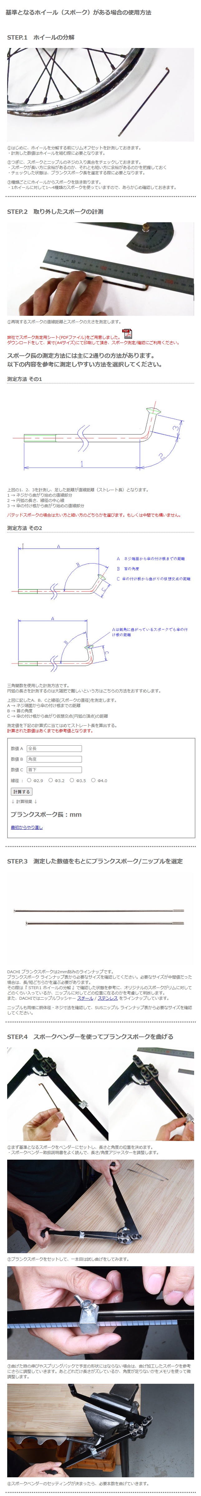 『スポークベンダー』 を使用して、必要なスポーク角度に曲げ加工をするためのベーススポーク。様々な車両に対応するため2mm刻みで長さをラインナップ。ステンレス製で錆びに強く、メッキには無い上質な質感を提供。