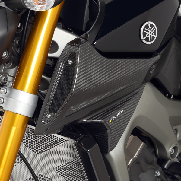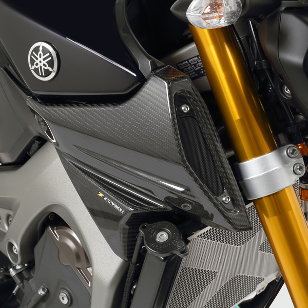 純正品と比較してエアスクープをより大型化することでカーボンの存在感をアピール。カーボン特有の質感と力強さを強調したデザインで、車体をスタイリッシュに演出する。仕様: ドライカーボン製