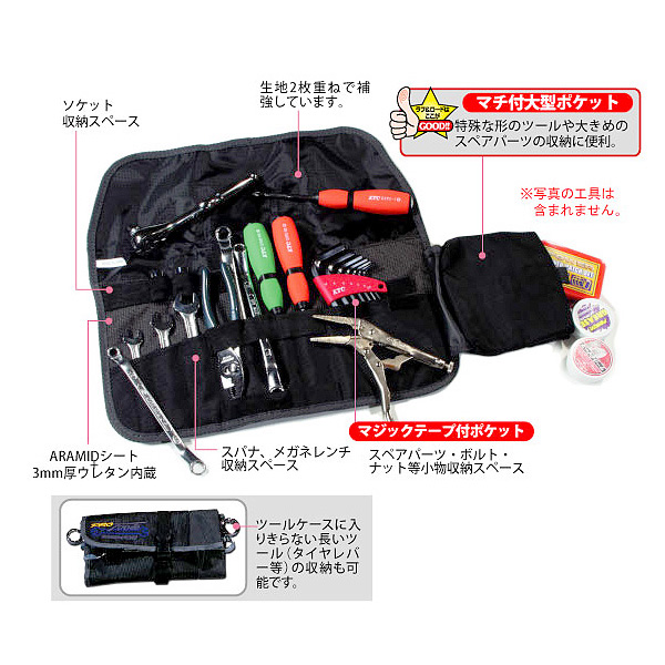 ベストセラーの汎用ツールケース。純正工具にマイ工具をプラスできる携帯にベストなサイズ設定。フィールド実践テストにより生み出された専用設計で使い勝手も抜群。