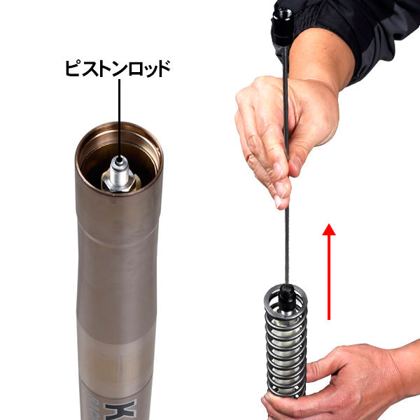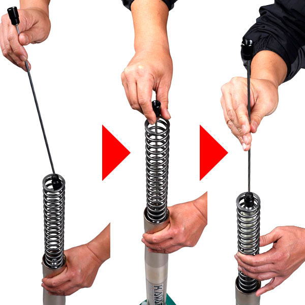 フロントフォークのピストンロッドを引き上げるためのツール。針金などで代用すると作業性が悪いが、この工具を使うことでスプリングに干渉することなくスムーズに引き上げることができる。エア抜きする際のブリーディングロッドとしても使用可能。ピストンロッドのネジサイズ M10×P1.0, M12×P1.25に対応。(全長 : 350mm)