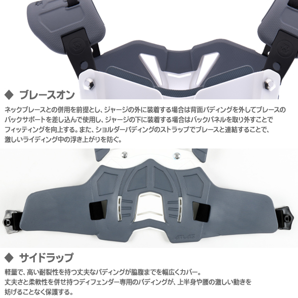 アトラスブレースとのフィッティングに優れるイン・アウト兼用ブレストガード。パディングを含めて完全防水で、吸水しないため濡れても重くならず、丸洗いも可能。軽量で丈夫な専用パディングが脇腹までを幅広くカバーする。
