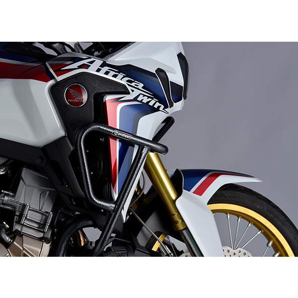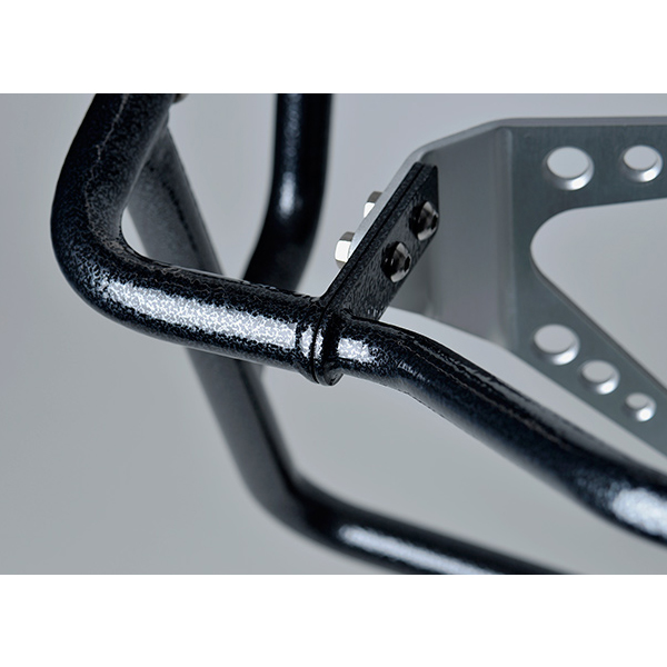 フロントカウル、ラジエーター、クランクケースの3箇所を確実に守り、保護するエンジンガードとしての機能。アドベンチャーモデルに必要とされる強度と、転倒後にも再スタートできることを目的とした設計。エンジンガードであっても無骨なだけではなく全体像として魅せる姿、ディテールでも所有欲を十分に満たせる仕上がり。