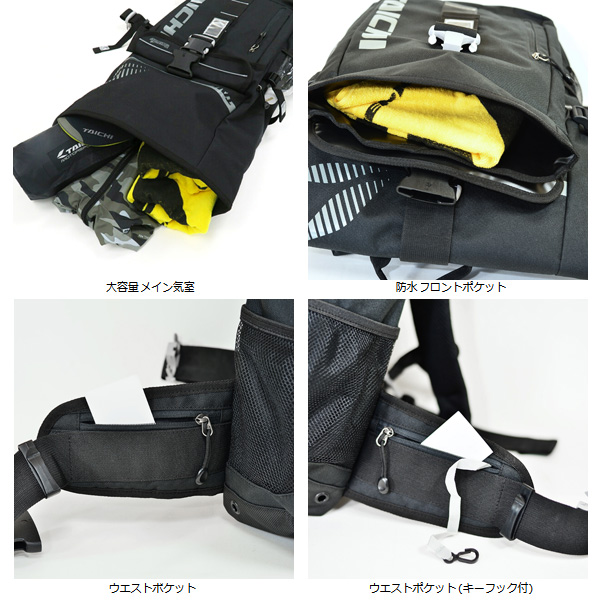 防水仕様のバックパック。大容量のメイン気室とフロントポケット(防水)により、目的に合わせた収納が可能。エアスルータイプの背面クッションと人間工学に基づいたショルダーハーネスの採用により、長時間の使用でも疲労を最小限に抑えます。