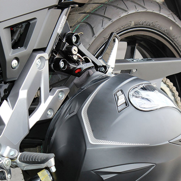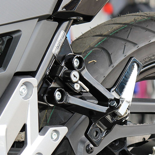 外出先でのヘルメット保管の不安を軽減する、ヘルメットロック。主張を抑えた車種専用設計。装着箇所:左側タンデムブラケット付け根