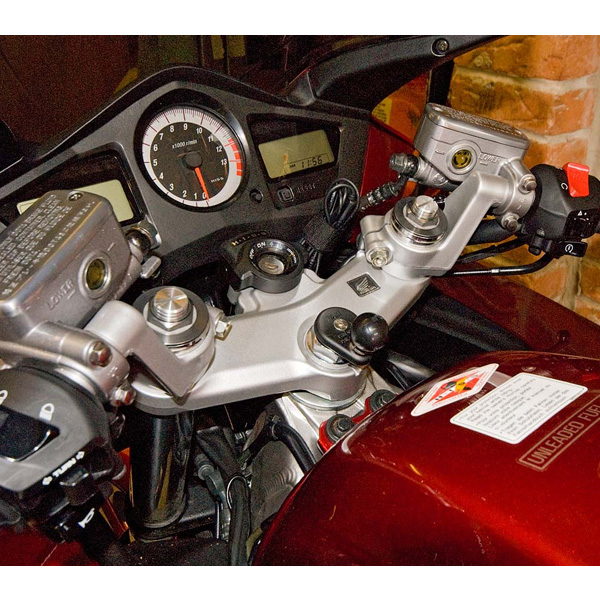 ベース部単品です。(アーム部、マウント部を別途ご用意ください。)セパレートハンドル車両など、トップブリッジの中央に空いている穴を利用して装着します。