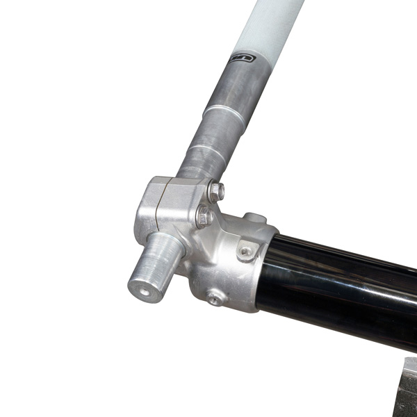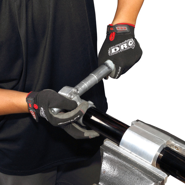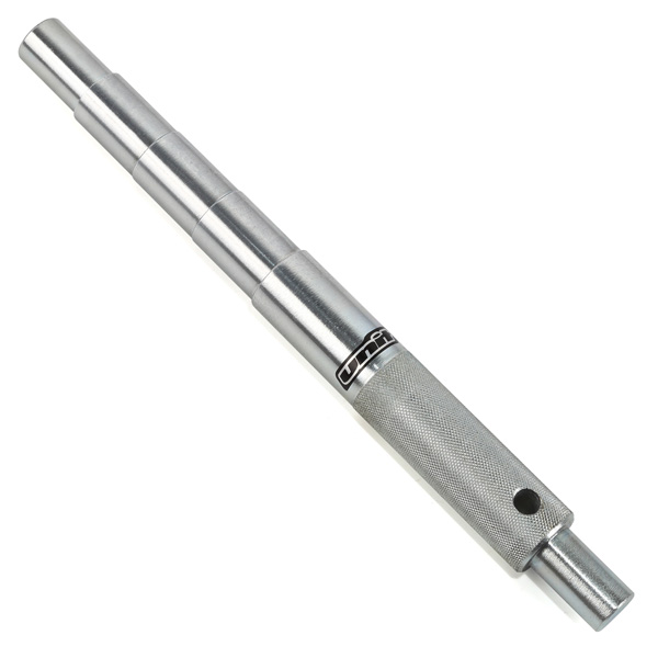 別売り UNITパイプクランプ (品番:UN-P3505)等を使用してインナーチューブを固定し、アクスルブラケットのシャフト穴にアクスルスピナーを挿入して着脱。ブラケットに緩み止めネジがある場合は必ず分解前に取り外してください。