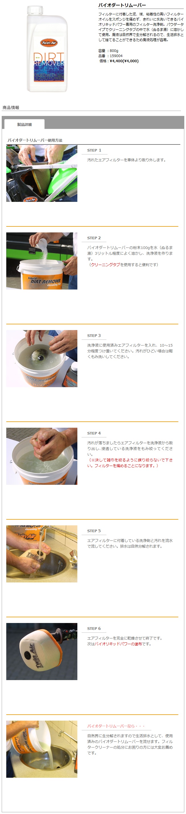 フィルターに付着した泥、埃、粘着性の高いフィルターオイルをスポンジを痛めず、きれいに水洗いできるバイオリキッドパワー専用のフィルター洗浄剤。パウダータイプでクリーニングタブの中で水(湯)に混ぜて使用。バイオリキッドパワーの油分を完全に分解。使用後の洗浄液は生活排水に捨てることができる為、廃液の処理が容易。