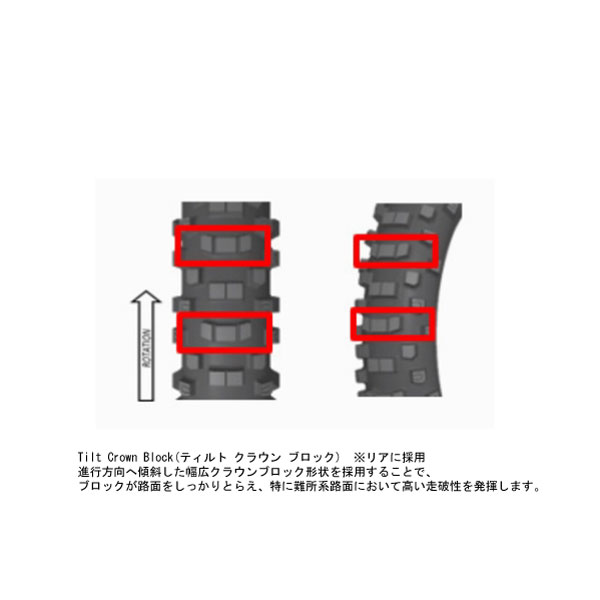 コースの路面コンディションが多様化している近年のエンデューロ競技に対応し、路面適応性を拡大することで高い操縦安定性能を実現したタイヤ。フロント、リアとも新たなトレッドパターンを採用することで路面追従性が向上し、砂地や泥ねい地から岩が堆積した路面まで、幅広い条件で安定した走行を生み出す。